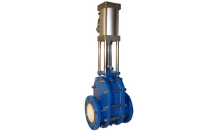 陶瓷双闸板阀借助气缸或手轮提供的外动力,阀杆带动阀板上下移动实现阀门的启闭,阀门启闭过程中依靠双闸板之间设置弹簧的预紧力是阀板和阀座紧密接触,实现密封。